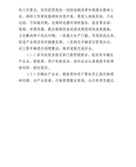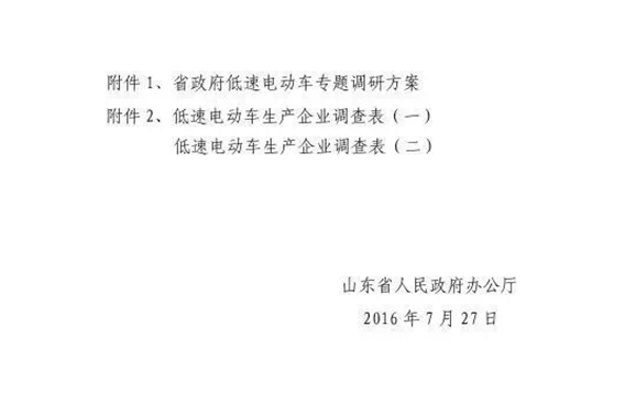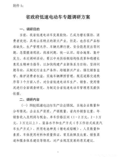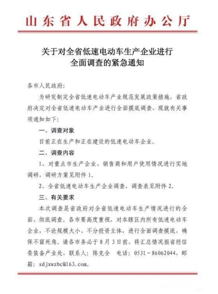 為了規范低速電動車產業,制定產業政策,山東省政府決定對全省低速電動車進行摸底調查,于7月27日發布了《關于對全省低速電動車生產企業進行全面調查的緊急通知》,對山東省內的生產企業不論規模大小及投資主體,進行全面的摸底調查。