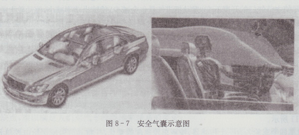 駕駛員處的安全氣囊是存放在轉(zhuǎn)向盤襯墊內(nèi)的,因此當看見轉(zhuǎn)向盤上標有“SRS,,或“~irbag’’字樣,就可知此車裝有安全氣囊。安全氣囊系統(tǒng)主要由傳感器、微處理器、氣體發(fā)生器和氣囊等主要部件組成。傳感器和微處理器用以判斷撞車程度、傳遞及發(fā)送信號。氣體發(fā)生器根據(jù)信號指示產(chǎn)生點火動作,點燃固態(tài)燃料并產(chǎn)生氣體向氣囊充氣,使氣囊迅速膨脹。安全氣囊示意圖如圖8—7所示。