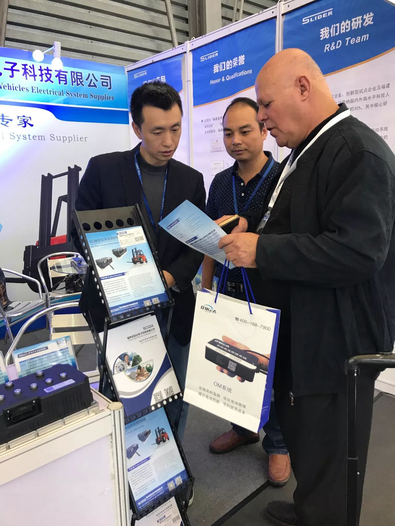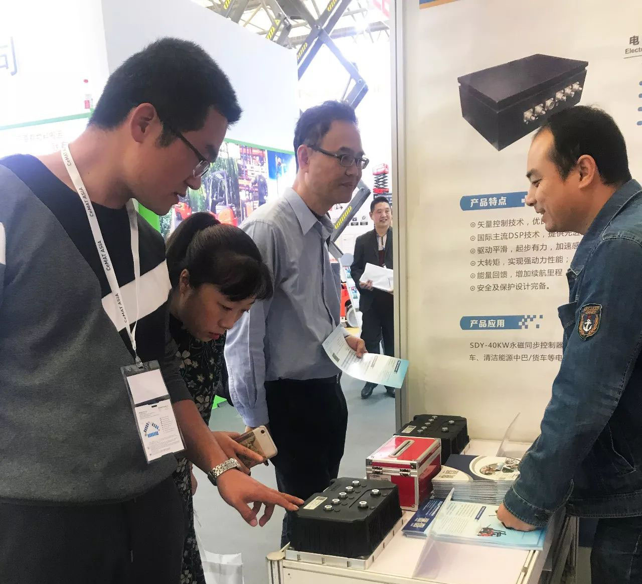 此次展會重點展出了我司新研發的SCJ系列控制器,SCJ系列是針對叉車開發的交流異步電機控制器。應用了先進的矢量控制算法和MOSFET驅動技術,采用CAN總線或無線藍牙通訊方式,可通過電腦或手機平臺對控制器實現編程及監控;本機具有電機自動匹配功能,能使電機以高效率運行;具備短路、過載、過溫、高低壓等多重保護功能。